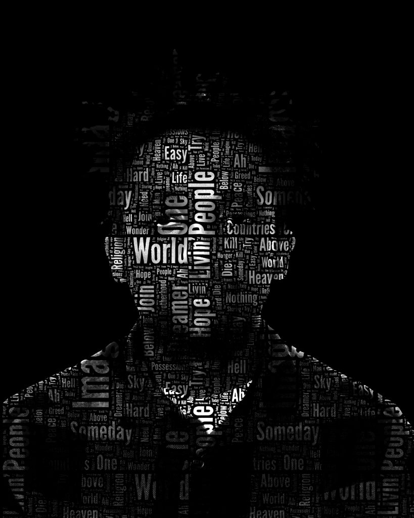 This is my first attempt at creating a Photoshop self-portrait. I find it very difficult to use compared to other Adobe software, so I decided to watch some helpful tutorials about the programme and decide to create a typography self-portrait for my project. I copy the Imagine John Lennon lyrics from the internet and paste them into a mob photoshop file. Next, I try to arrange the entire lyrics in a beautiful way on an A4 page.