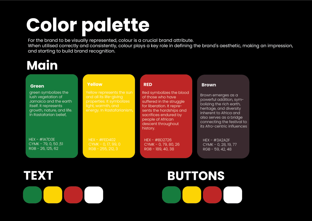 Transitioning from a low-fidelity wireframe to a mid-fidelity prototype marks a pivotal stage in our project, prompting a deeper exploration of design elements. As we delve into this phase, the initial focus turns towards selecting an apt color palette that resonates with the essence of the Reggae Festival and Afro-Caribbean culture we seek to embody. Drawing inspiration from the rich tapestry of Reggae music and its intertwined culture, we find a compelling connection to the vibrant hues of green, yellow, and red. These colors hold significant meaning within the Rastafarian movement, originating in Jamaica, where they symbolize aspects of nature, spirituality, and historical struggle. Incorporating this palette into our design not only pays homage to the cultural roots of Reggae but also infuses our prototype with a dynamic energy that reflects the spirit of the festival and its diverse community.
