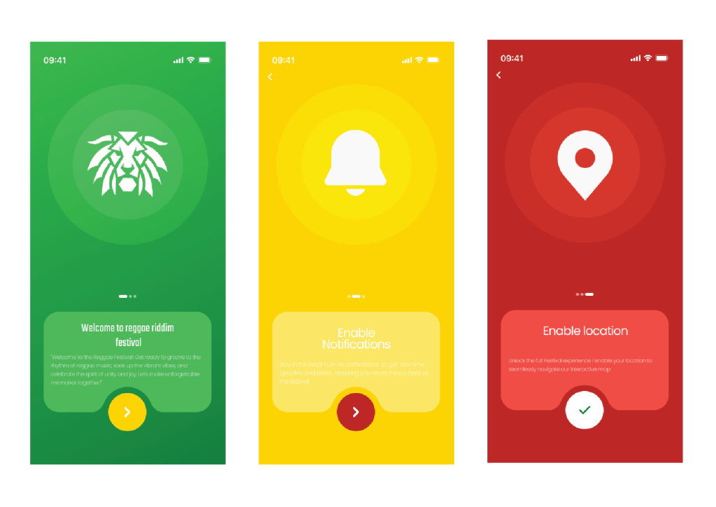 iThe three-page layout of my onboarding app design gives users a more efficient experience. The festival logo adorning the welcome page sets a cheerful and inviting tone that sparks excitement for the festival experience. By providing users with real-time alerts about schedule modifications and special announcements, the enable notification page increases user engagement. Finally, the enable location page provides useful features that enhance attendees’ overall festival experience by enabling customised suggestions and easy navigation specific to the festival venue.