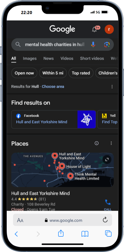 For example, these NGOs show up when I search for “Mental Health Charities in Hull.”