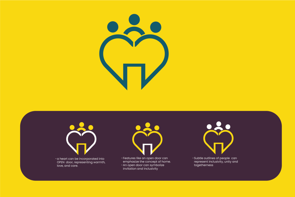 Lastly, I used a people figure to highlight inclusivity, community, and connection. Because it emphasises that Welcome House is focused on individuals and families, I found this feature to be significant. People congregate there, exchange stories, and offer mutual support. The people figure fosters a sense of solidarity and belonging by symbolising the organization’s core constituency, the people it serves. I believe that the final logo I created by fusing the heart, gate, and people figure perfectly captures the spirit of Welcome House a haven of safety, warmth, and unity.