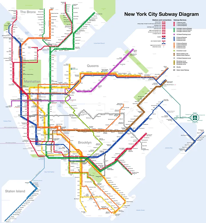 Colour plays a crucial role in this process, as muted tones can recede into the background while vibrant colours highlight important information. For example, in Figure 2, desaturated land and water serve as a backdrop, allowing transit lines to stand out. Overloading a design with excessive detail, such as a satellite image, would make it harder to interpret.
