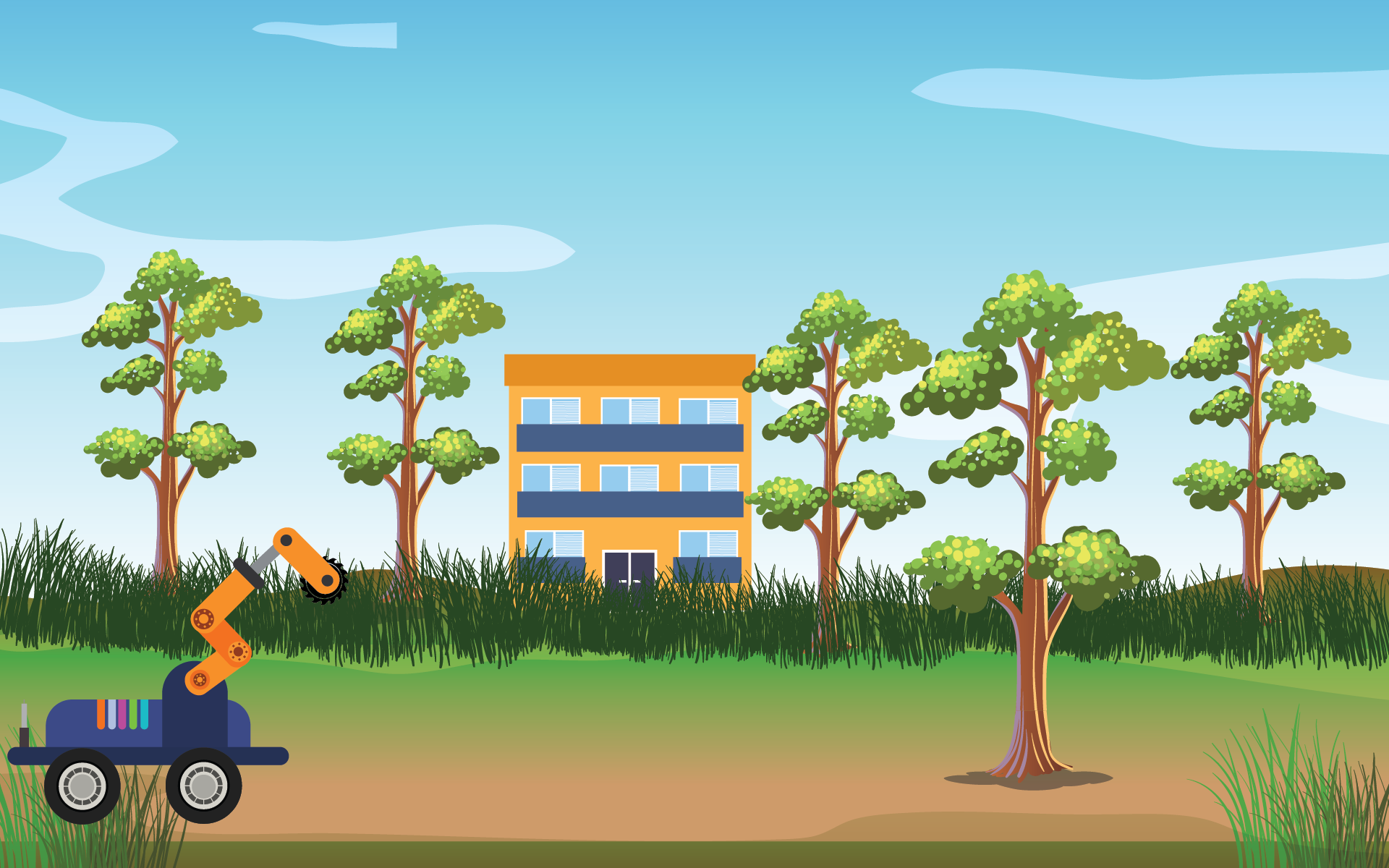 In my work, I limited the palette to natural greens and blues for the outdoor environment, maintaining a calm background. In contrast, the robotic arm is coloured in bright orange, immediately standing out to show its importance and function.