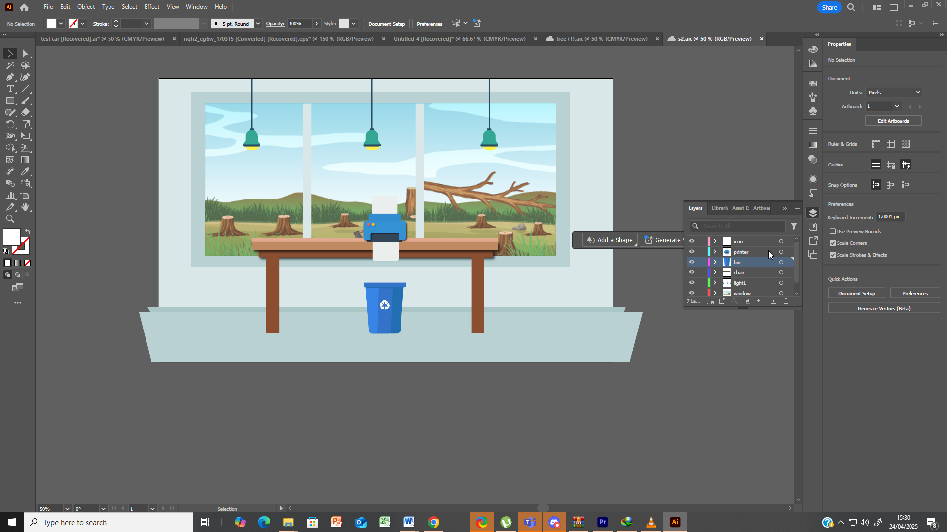 In the indoor scene, the table and printer are in the midground, while the deforested background seen through the window stays lighter and less detailed, creating clear depth.