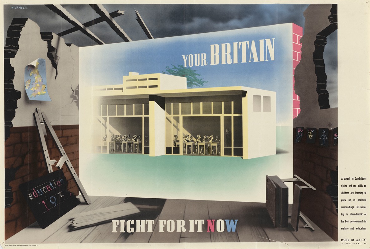 The Your Britain – Fight for It Now poster visually contrasts two visions of Britain. At its centre is a clean, modern school building labelled “Your Britain,” representing progress, education, and hope for a better future. The calm colour palette and structured architectural forms reflect post-war ideals of stability, order, and long-term social improvement. Surrounding this optimistic image is a dark, damaged interior space with crumbling walls and broken objects, symbolising poor living conditions and social neglect experienced during and after the war. This sharp contrast encourages viewers to reflect on the kind of society they want to rebuild.
