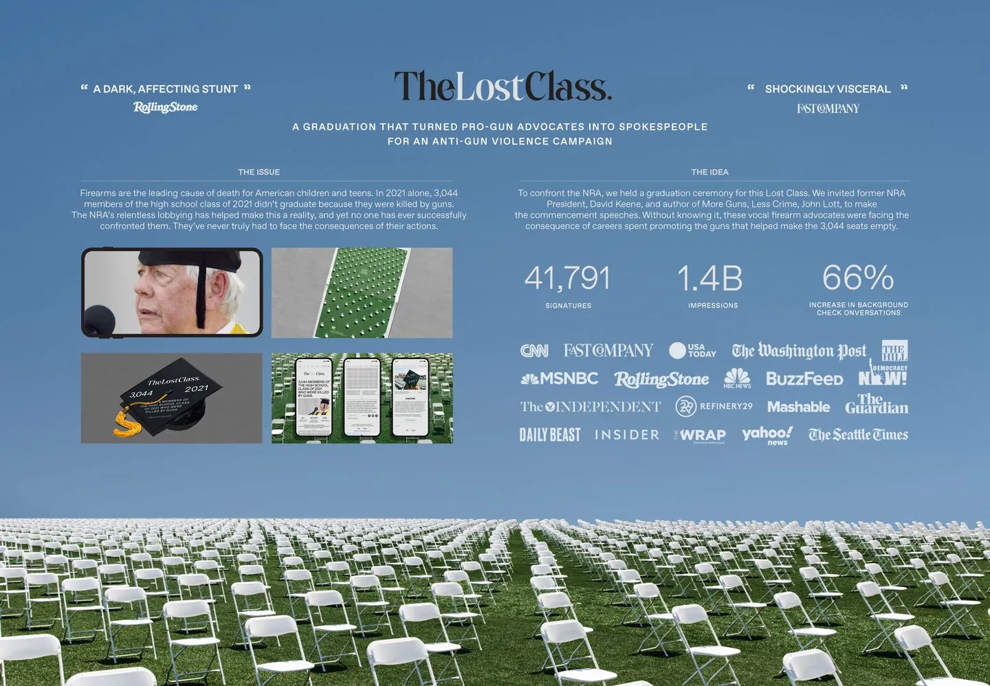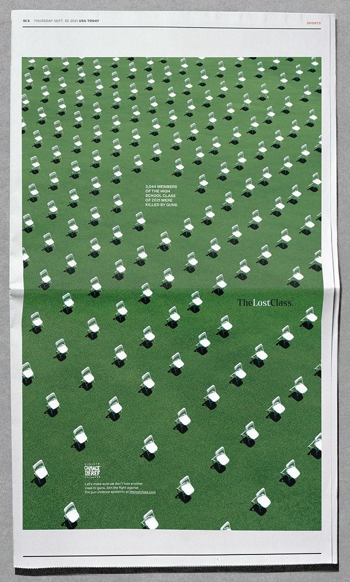 At the heart of the campaign was a stark visual metaphor: 3,044 white folding chairs, each representing a life lost to gun violence, arranged individually across a Las Vegas soundstage. The chairs, spaced meticulously, evoked the rows of tombstones at Arlington National Cemetery, as explained by Sam Shepherd, Executive Creative Director at Leo Burnett: “That’s what the graduation chairs represented to us… Arlington National Cemetery and the way the tombstones are arranged played a major role in our idea.”